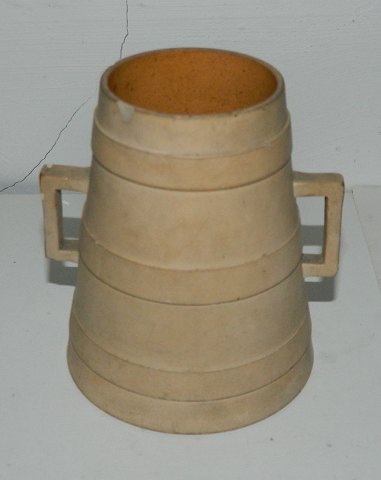 Krukke med hanke i teracotta fra P. Ipsen 19. årh. Fremstår med et par små skår ellers ingen skader eller reparationer. Glaseret indvendigt. Fabriksmærket på bunden. 10½ cm høj.