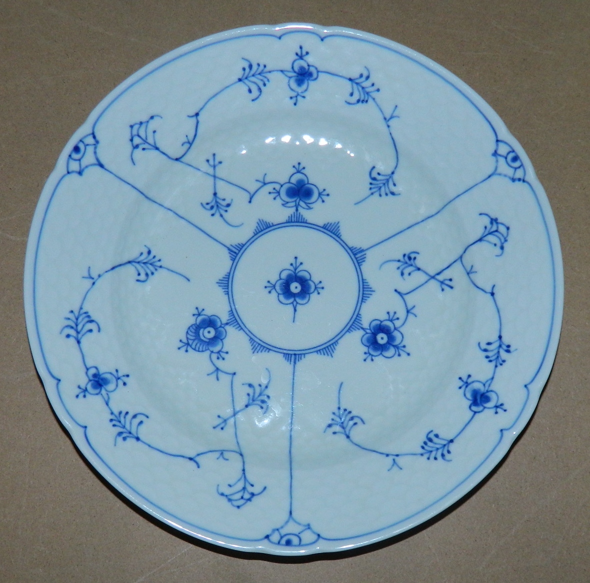 Middagstallerken i musselmalet porcelæn fra Bing og Grøndahl. Modelnummer 10. Fremstår i god stand uden skader eller reparationer. 2. sortering. Fabriksmærket på bagsiden. 24 cm i diameter. 8 stk. haves (1/11-13) LIGNENDE KØBES