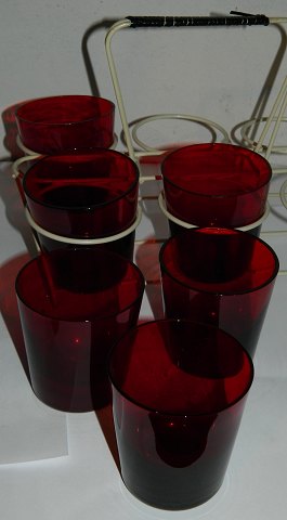 Seks røde vandglas incl. stativ. Alle glas i perfekt stand. Glassene er 7 cm høje.