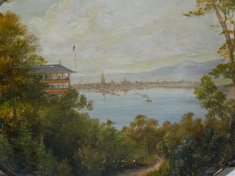 Platte i terracotta fra Peter Ipsen, København, fra omkring 1900. Dekoreret med kystmotiv fra ubekendt område. Fremstår i god stand. Et par ridser / pletter i overfladen hvorved bemalingen er væk. Fabriksmærket på bagsiden sammen med modelnummer. 25 cm i diameter.