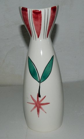 Hvid vase med farverig dekoration bl.a. blå fugl fra Stavangerflint i Norge. Fremstillet i fajance. Fremstår i perfekt stand. Dekoration af Inger Waage. Fabriksmærket på bunden. 19½ cm høj.