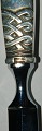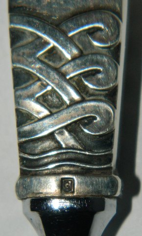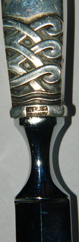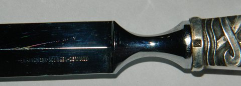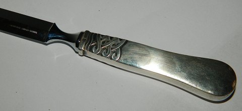 Georg Jensen brevkniv / brevåbner i Sterling Sølv. Fremstillet mellem 1933-44. Dekoration nederst på skaftet i relief. Stemplet på to sider. Bladet i stål fra Solingen, Tyskland. 20 cm lang.