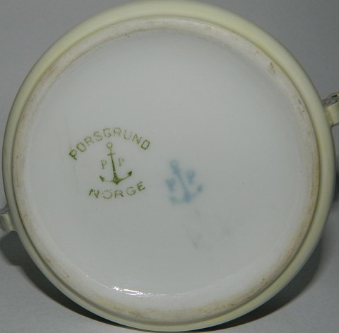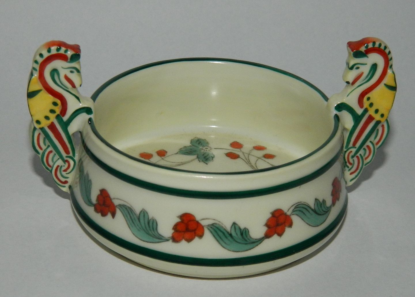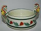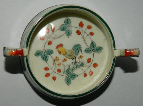 Skål i porcelæn fra Porsgrund i Norge. Begyndelsen af 20. århundrede. Dekoreret med par hank i form af søheste samt bemalet dekoration af hane i bunden af karet. Fremstår i perfekt stand. Fabriksmærket på bunden. 5 cm høj.