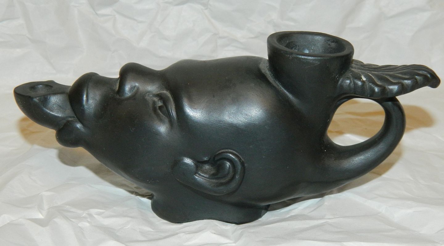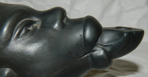 Afrikansk mandehoved i keramik som olielampe. På højre side mindre revne (produktionsfejl) ellers i god stand uden skader eller reparationer. Fremstillet i begyndelsen af 20. århundrede hos Lauritz Hjorth, Bornholm. Fabriksmærket på bunden: L. HJORTH BORNHOLM modelnr. 754. Olielampen er 7 cm høj og 17 cm lang.