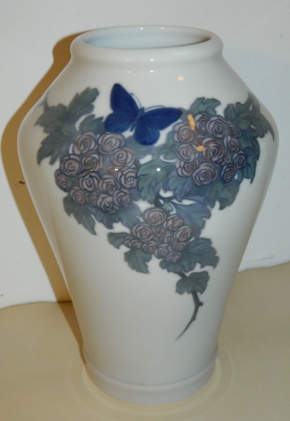 Stor vase i porcelæn fra Royal Copenhagen med dekoration af roser og blade samt sommerfugle. Fremstår i perfekt stand uden skader eller reparationer. 28 cm høj.