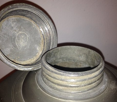 Sekskantet beholder i tin med låg. Dekoreret med oval punslet ramme med ejerens initialer heri. Fremstår i god stand med almindeligt brugsslid. Fremstillet i første halvdel af 19. århundrede. Ingen skader eller reparationer. Højde incl. opretstående hank: 30½ cm.
