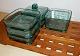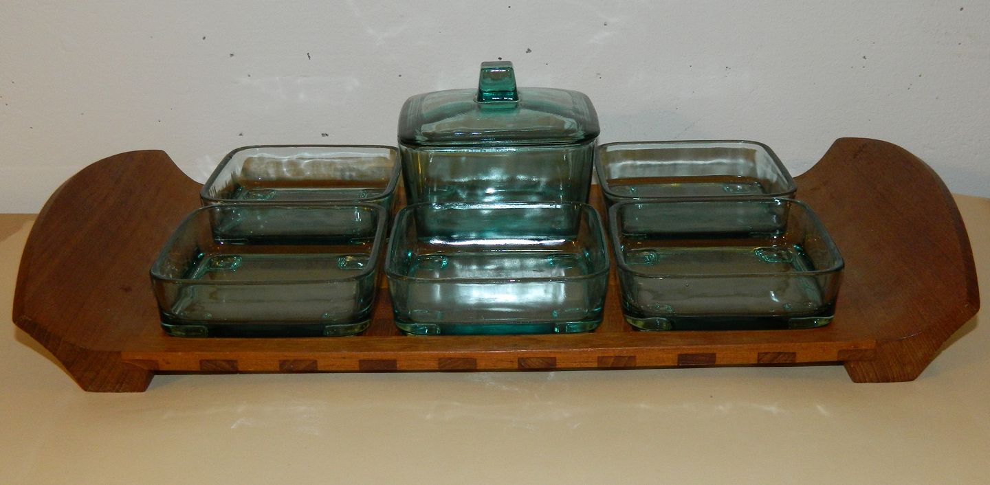 Bakke i teak hvorpå der står seks skåle i glas. Èn med låg. Alle dele i god stand uden skader eller reparationer. Fremstillet ca. 1970 af Jens Harald Quistgaard. Bakken er på bagsiden stemplet IHQ DENMARK. Mål: Bakken er 46½ cm lang og 23½ cm bred. Skålene måler 11 cm x 11 cm. Lågskålen er 10 cm høj.