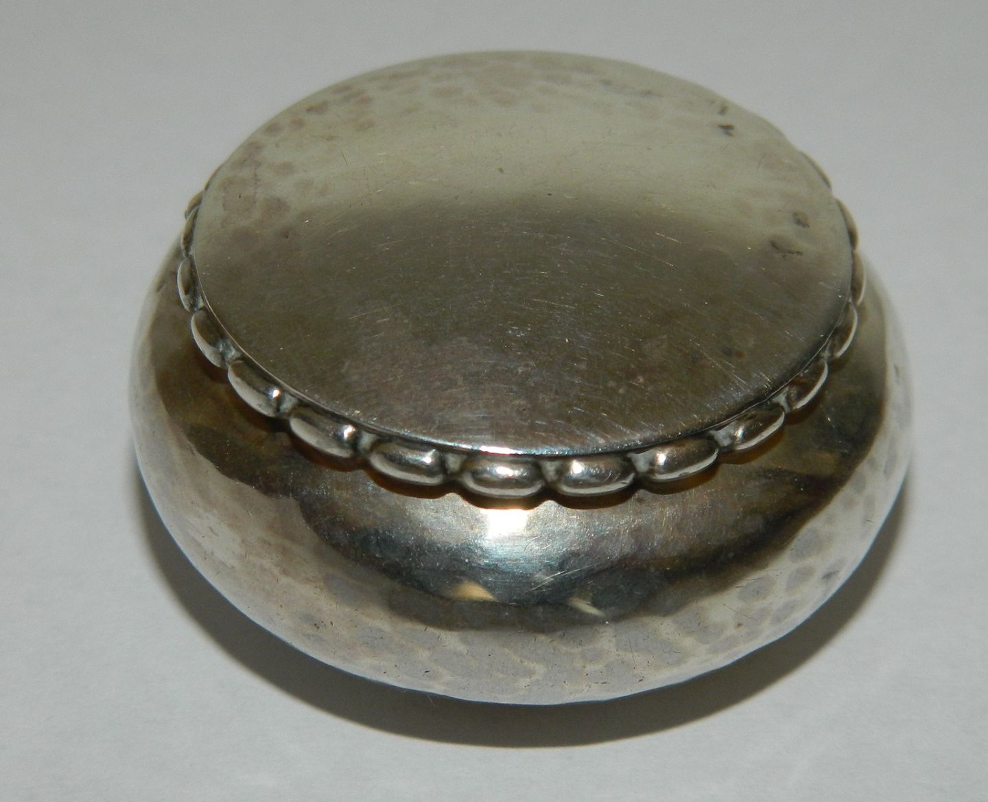 Georg Jensen pilleæske i sterling sølv. Fremstillet mellem 1909-14. I god stand uden skader eller reparationer. Ingen buler. Trænger til at blive pudset indvendigt. 2 cm høj og 4 cm in diameter.