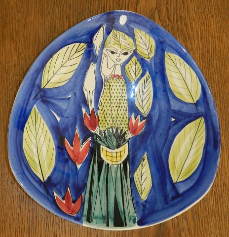 Stort organisk formet fad i fajance fra den norske fabrik Stavangerflint. Dekoreret med ung kvinde. Designet af Inger Waage. Fremstår i perfekt stand uden skader eller reparationer. Fabriksmærket på bunden. Rester af den originale fabrikslabel over hovedet på den uge kvinde. Mål: 6½ cm høj og 32 cm i diameter.