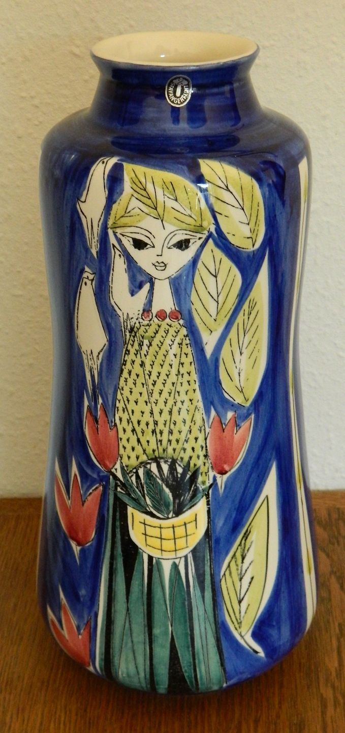 Stor vase i fajance med dekoration af ung kvinde. Designet af Inger Waage for Stavangerflint i Norge omkring 1960. Fremstår i perfekt stand uden skader eller reparationer. Fabriksmærket på bunden. Over kvindes hoved sidder original fabrikslabel. Vasen er 37 cm høj.