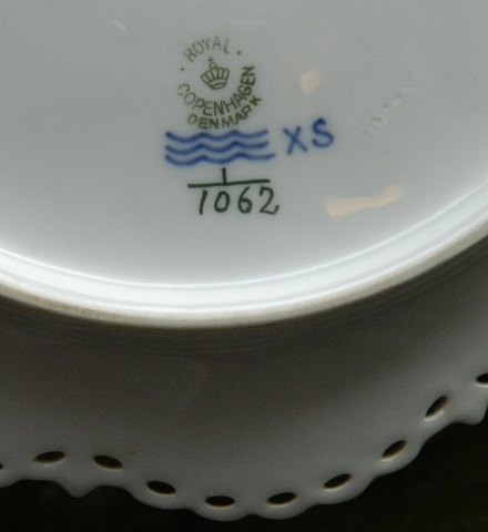 Helblonde musselmalet frugtskål i porcelæn med tilhørende underfad i fra Royal Copenhagen. Fremstår i god stand uden skader eller reparationer. Skålen, modelnummer 1/1061, er 2. sortering. Fadet, modelnummer 1/1062, er 1. sortering. Mål: Skålen er 9 cm høj og øverst diameter på 23 cm. Fadet er 25½ cm i diameter.