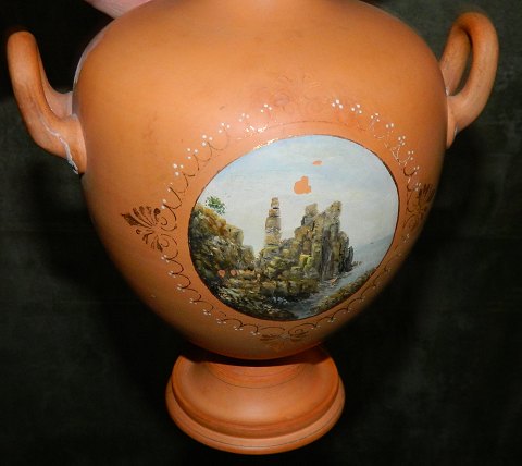Græsk vase med motiv af Helligdomsklipperne på Bornholm. Vasen er fremstillet hos Michael Andersen i 1890´erne. Som det fremgår af billedet er der lidt overflade ridser i motivet. Derudover ses lidt kalkaflejringer her og dér på vasen. Ingen skader eller reparationer. Fabriksmærket på bunden med indstemplet M. A. samt modelnummer 75. Vasen er 25 cm høj.