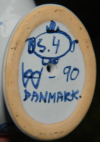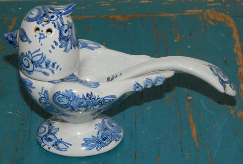 Figur i fajance fra Bjørn Wiinblad. Salt -og peber fugl dekoreret i blåt. Alle dele fremstår i god stand uden skader eller reparationer. Fabriksmærket på bunden. 10 cm høj og 16 cm lang.