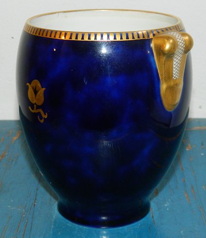 Blå og guldbemalet krukke fra Bing & Grøndahl fra begyndelsen af 20. århundrede. Formoder at der har været låg til denne krukke ! Fremstår i god stand uden skader eller reparationer. Fabriksmærket på bunden. 12½ cm høj