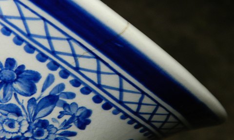 Vase i fajance fra Aluminia med Eremitage-dekoration fra omkring 1920. Fremstår i god stand med almindeligt brugssslid. Herunder mindre hårrevne på kanten (se både indvendigt og udvendigt) samt meget lille glasurafslag på kanten (se foto). Fabriksmærket på bunden med EREMITAGE KØBENHAVN samt svagt indstemplet ALUMINIA. Vasen er 28½ cm høj.
