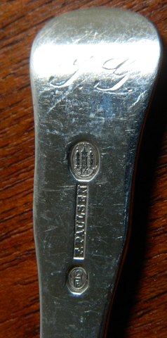 Ske i "Skovlform" i dobbeltriflet sølv. Kraftig udgave ! Fremstår i god stand. På bagsiden sølvstempler samt monogram. 11½ cm lang
