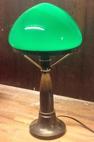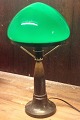 Bronzelampe med grøn glaskuppel fra ca. 1930. Begge dele i god stand med alm. brugsslid. Fungerer fint. Lampen er 43 cm høj.