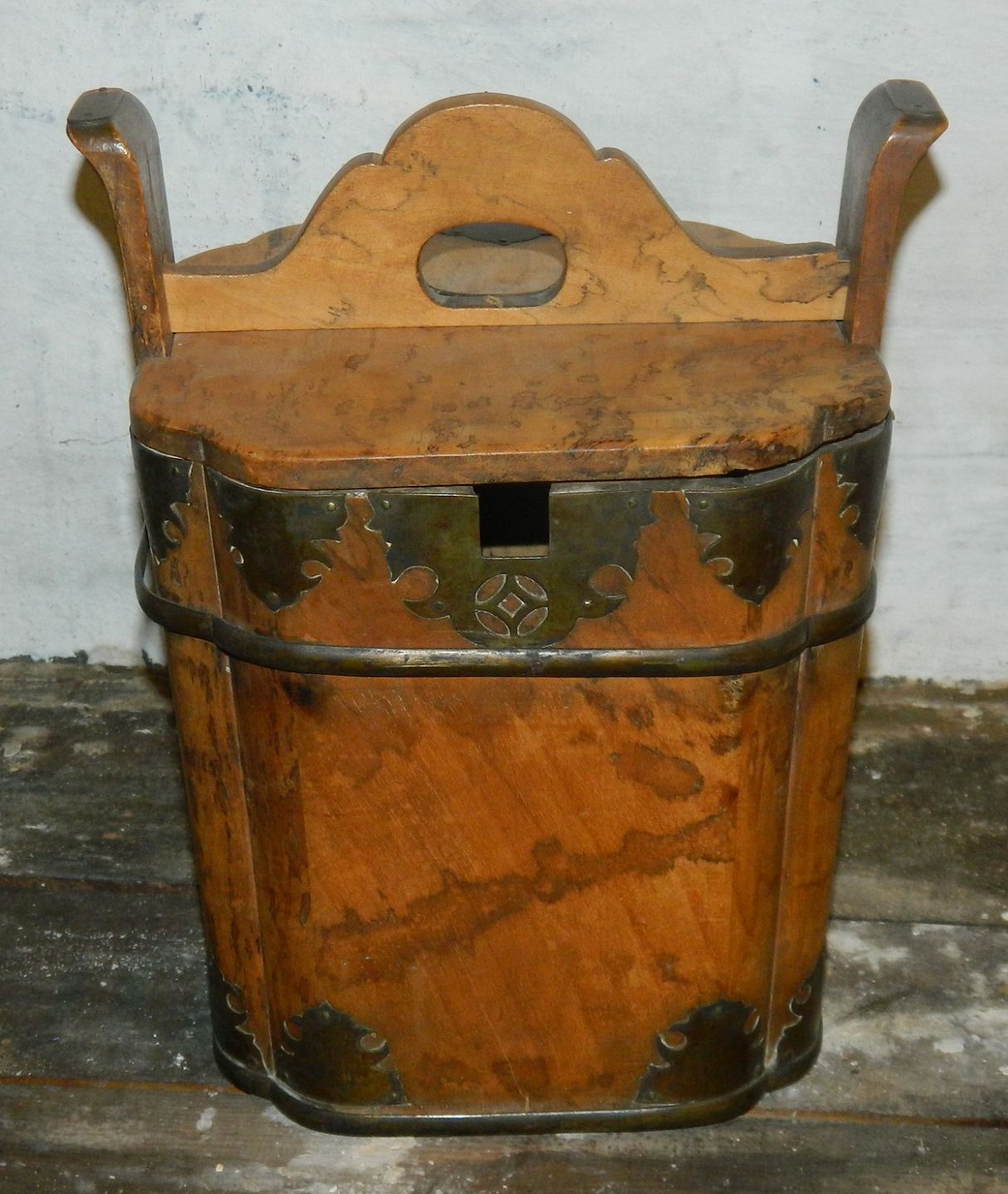 Madspand i rodtræ (tejne) med metaldekoration. I god stand. Fra slutningen af 19. århundrede. Formodes fremstillet i Skandinavien. 24½ cm høj.