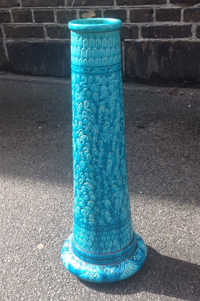 Art Nouveau Burmantoft fajance vase fra England. Indridset dekoration og dækket af turkis glasur. Fremstillet ca. 1900. Fremstår i perfekt stand. Fabriksmærke påstemplet bunden sammen med modelnummer 1401. Vasen er 50 cm høj.