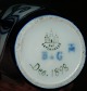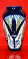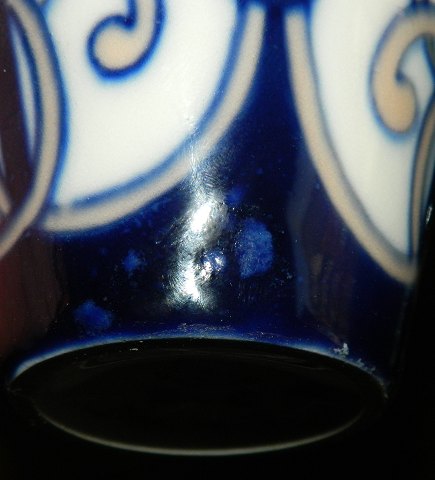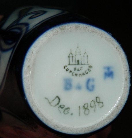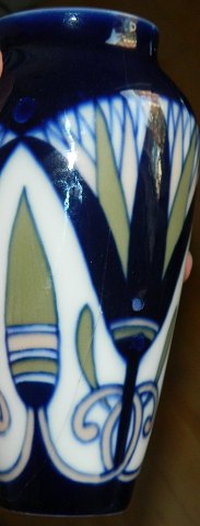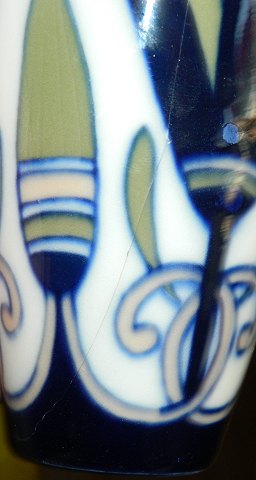 Vase i porcelæn med Art Nouveau dekoration. Fremstillet for Bing & Grøndahl i 1898 af ubekendt kunstner T.M. Fremstår med 18½ cm lang gennemgående revne. Hertil kommer 5-6 brændingsfejl i glasuren. Fabriksmærket på undersiden sammen med kunstnersignatur T.M. Vasen er 17½ cm høj.