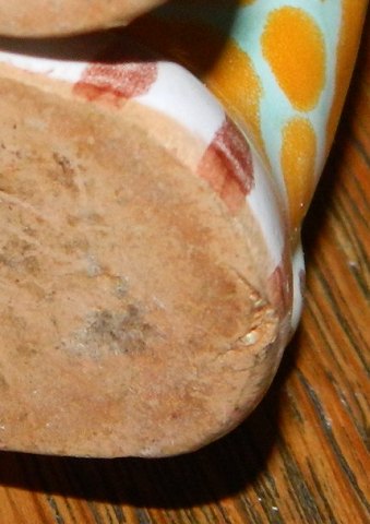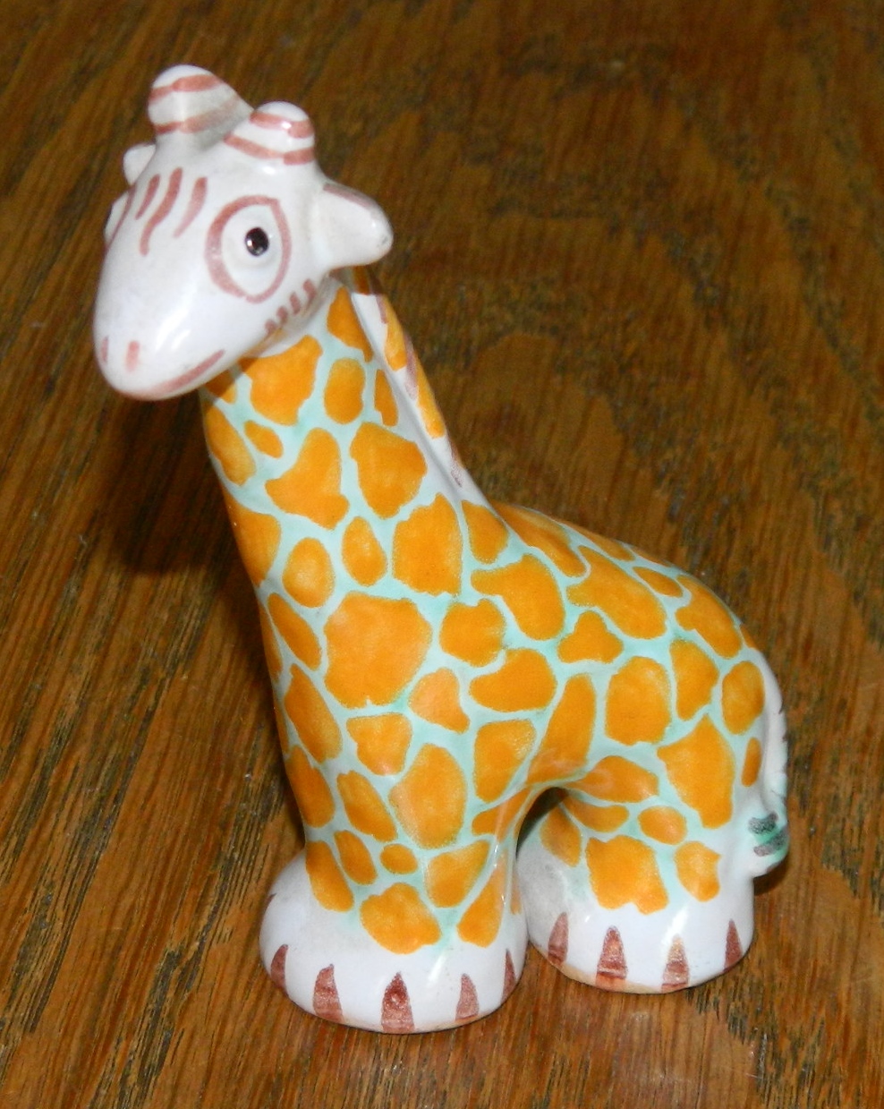 Figur af bemalet giraf fra Lauritz Hjorth, Rønne, Bornholm. Fabriksmærket på undersiden med L. Hjorth, Danmark. To mindre skår/"nålestik" på undersiden hvor stemplet ses - "kl. 10.30" og "kl. 12.30" På undersiden uden stempel ses mindre revne "kl. 15.00". 9 cm høj