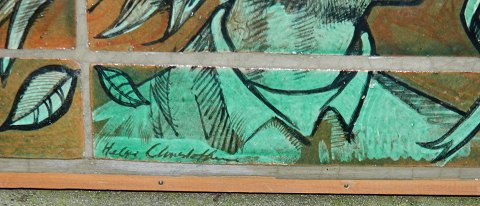 Motiv af ung kvinde malet af Helge Christoffersen. Portrættet er malet på kakler i keramik opsat på plade af træ. Fremstillet på eget værksted omkring 1950. Fremstår i god stand uden skader eller reparationer. Signeret af kunstneren i bunden af billedet. Mål: 30 cm x 50 cm.