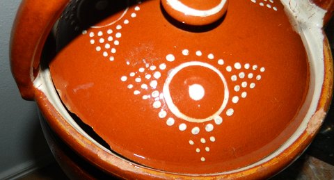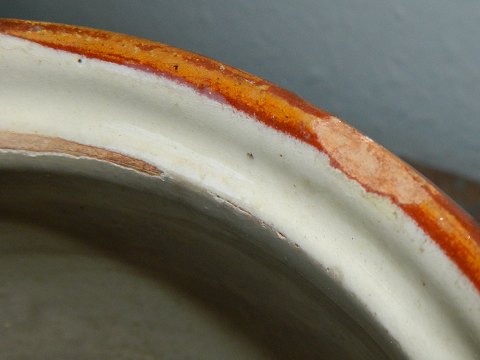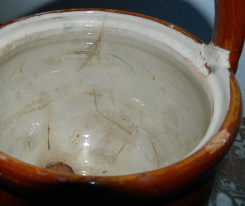 Dansk barselspotte i keramik fra ca. 1880. Fremstår med brugsslid - skår og revner som vist på fotografierne. 29½ cm høj