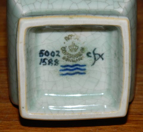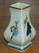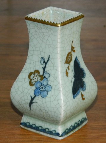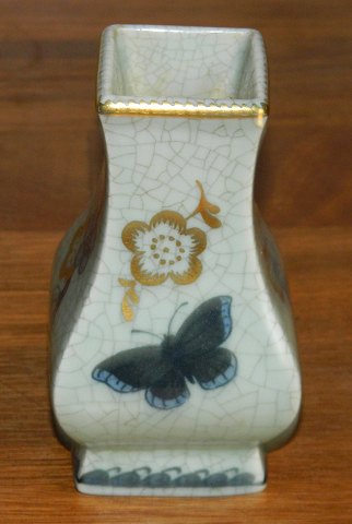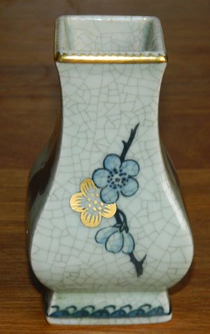 Japansk inspiration: Kgl. firesiddet vase i krakkeleret glasur i porcelæn med delikat dekoration af blomster, bladværk og sommerfugle i blå farver og guld. Fremstillet ca. 1940. Fremstår i perfekt stand. 1. sortering. Fabriksmærket på bunden. Vasen er 9½ cm høj