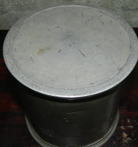 Tobakskrukke i tin fra 18. århundrede. Stemplet indvendigt i bunden med Københavnerstempel i 1780. Krukke og låg i god stand uden skader eller reparationer. 18 cm høj incl. låg.