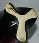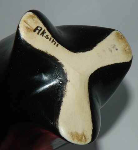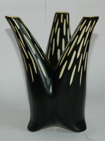 Organisk form fra Aksini i Danmark: Vase i keramik med tre halse og tre fødder ! Sort med hvide stafferinger. Designet af grundlæggeren Aksel Sigvald Nielsen (1910-1988), der indtil han grundlagde sit værksted 1954 havde arbejdet for den danske vestsjællandske keramikfabrik Knabstrup. Vasen fremstår i perfekt stand uden skader eller reparationer. Fabriksmærket på undersiden. Læg mærke til at navnet udspringer af grundlæggerens navn ! Vasen er 16 cm høj.