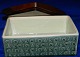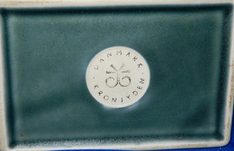 Firkantet skål i keramik fra Kronjyden. Dækket af grønglasur. Skålen er på fire sidder dækket af ordet "cigar". Låg i palisander fra Nissen. Mål: 7½ cm høj og skålen måler 10 cm x 15½ cm i omkreds. Fabriksmærket på undersiden af skålen.