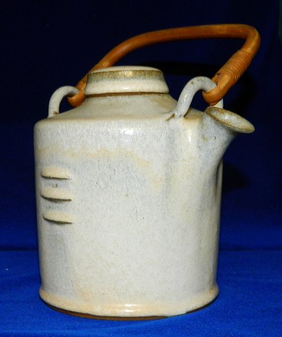 Tepotte i keramik af Finn Lynggaard fra eget værksted. Dækket af en lys grålig glasur. Hank i bambus i god stand. To små overfladeridser på kanten nederst på låget (se foto). Stemplet kunstnersignatur samt logo på undersiden. 15½ cm høj. 21½ cm høj incl. opretstående hank.