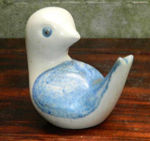 STENTØJSFIGUR AF KNUD BASSE: Figur i keramik af lille fugl i keramik. Vingerne dækket af en blålig glasur. Udført af Knud Basse (1916-1991), der havde sit værksted på Bornholm. Figuren er i perfekt stand. Signeret af kunstneren på bunden med KB. 8 cm høj.