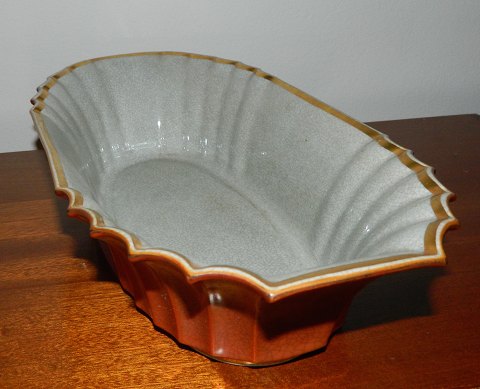 Art Deco stil: Jardiniere i rød krakelé fra Royal Copenhagen. Fremstår i perfekt stand. 1. sortering. Mål: 9 cm høj samt 13 cm x 37,5 cm. Fabriksmærket på bunden