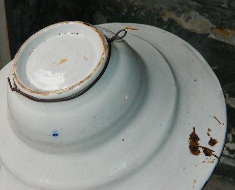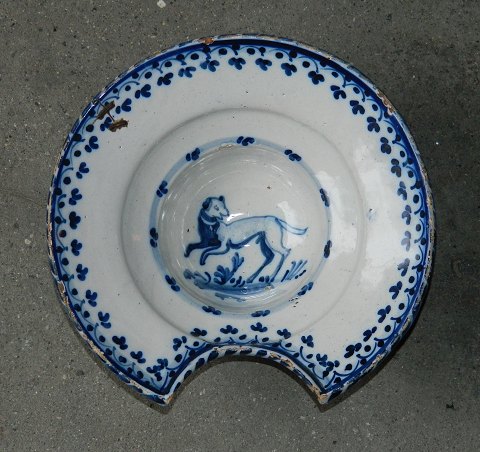 Smukt barberfad i keramik med dekoration af hund i bunden. Fremstår i god stand. Lille charmerende antik klinkning (se foto). Almindeligt brugsslid. Ingen fabriksmærke. Formodes fremstillet i Frankrig eller Italien. H. 12 cm Ø. 30,5 cm.