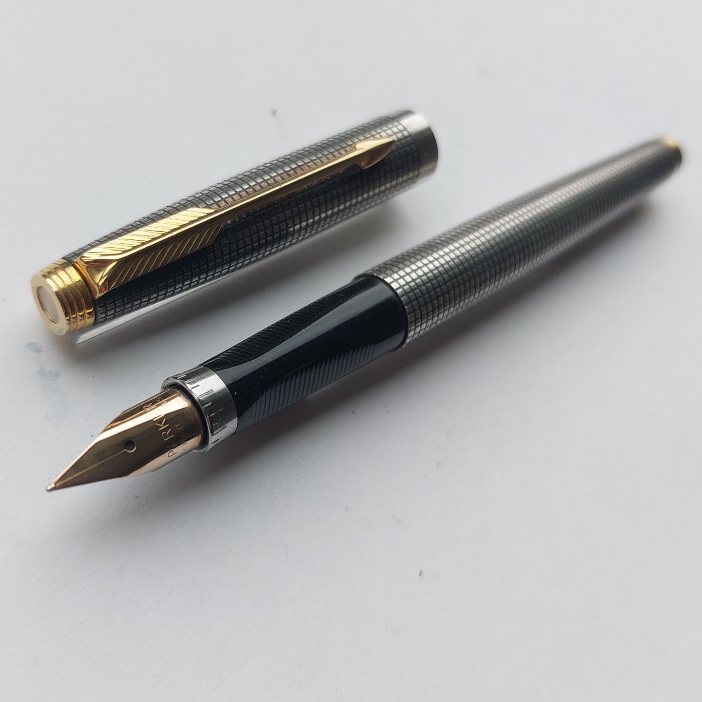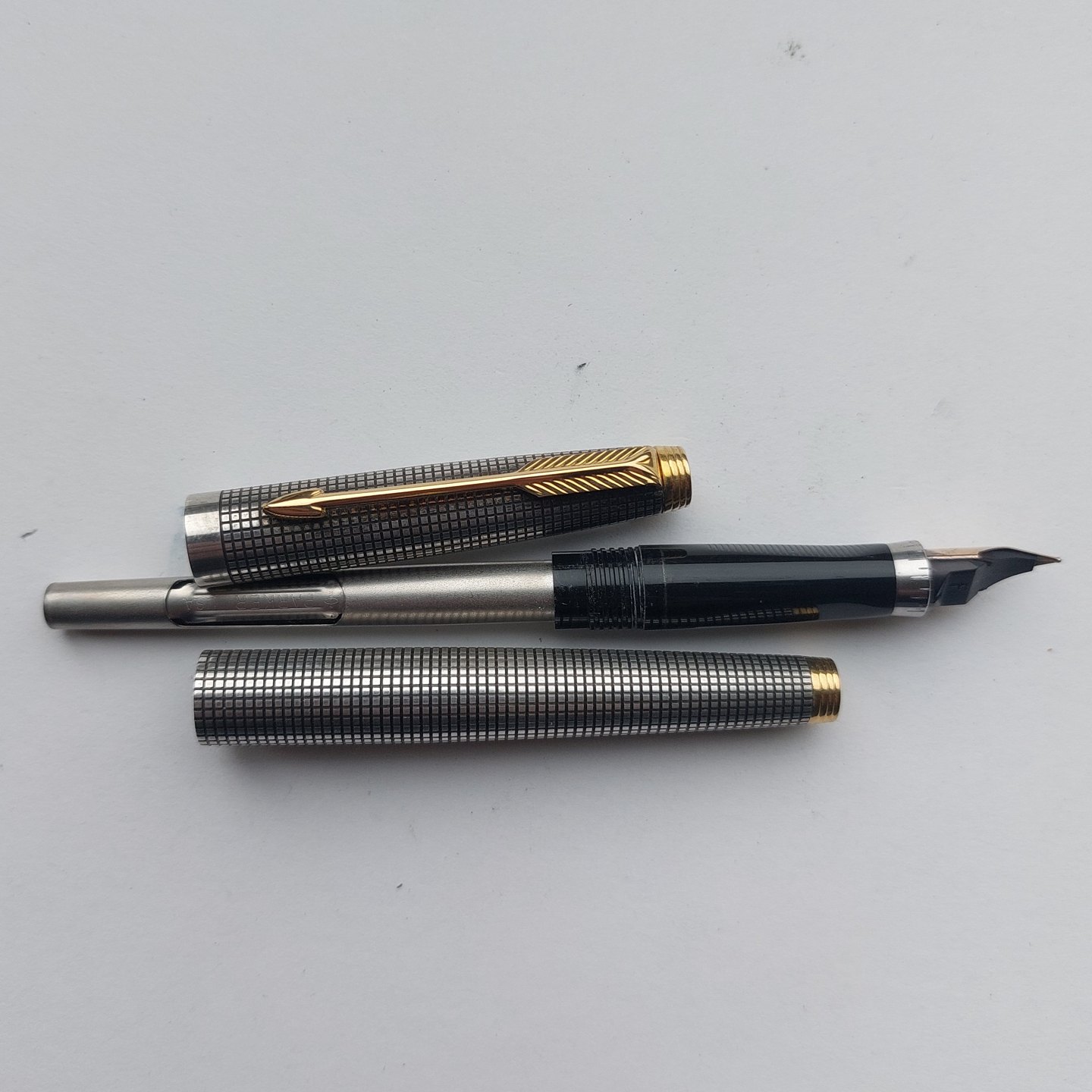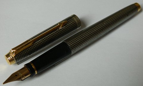 Parker fyldepen i 925S Sterling sølv. Fremstillet i Frankrig eller U.S.A. Alle dele originale bl.a. 585 guldspids. Ingen skader eller reparationer. Ingen buler eller stød. Klar til at blive brugt med "gammel" gummisæk. 13 cm lang.