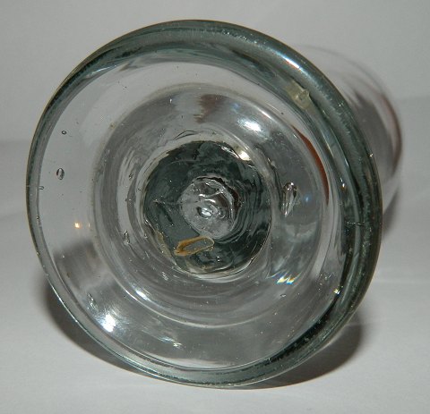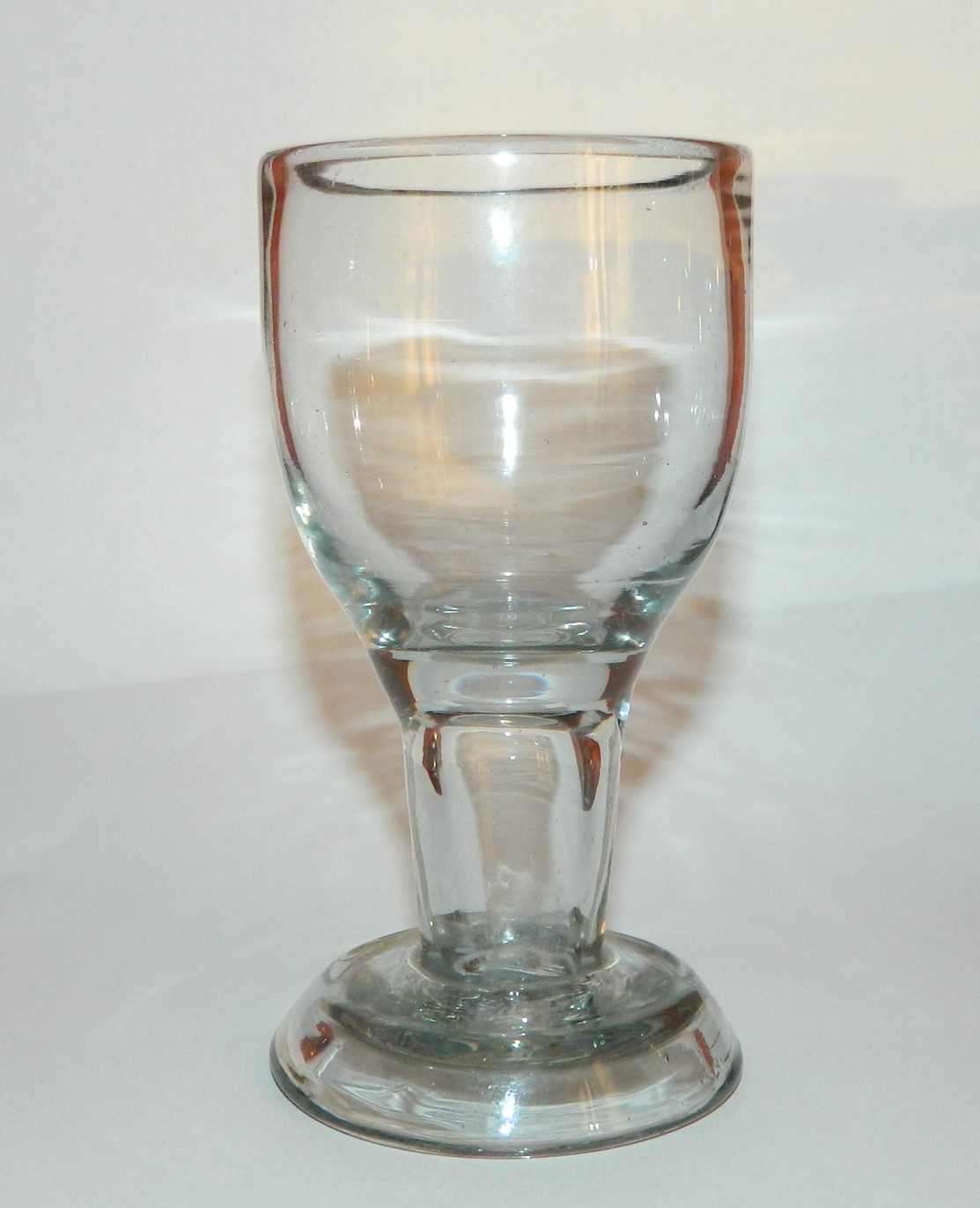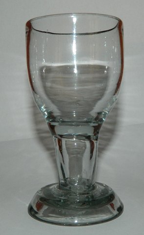Vinglas fra Holmegaard Glasværk. Udførelsen vil pege på Conradsminde Glasværk men modellen ses i Holmegaards priskurant 1853 (DANSKE GLAS 1825-1925 Alfred Larsen Peter Riismøller Mogens Schlüter). Hul stilk, ombukket fod. Glasset er 11½ cm højt