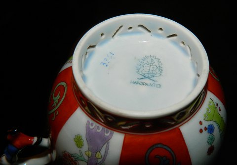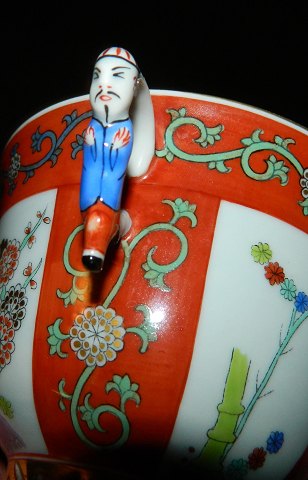 Porcelæn fra Ungarn: Stor kop og underkop fra den ungarnske porcelænsfabrik Herend. Kinesisk tema og dekorationer. "Kinamand" som hank. Hanken har en revne - muligvis fabriksfejl ! Både kop og underkop smukt dekoreret med gennembrudt fod. Koppen er 8 cm høj. Begge dele fabriksmærket. Underkoppen er 3½ cm høj og 17 cm i diameter.