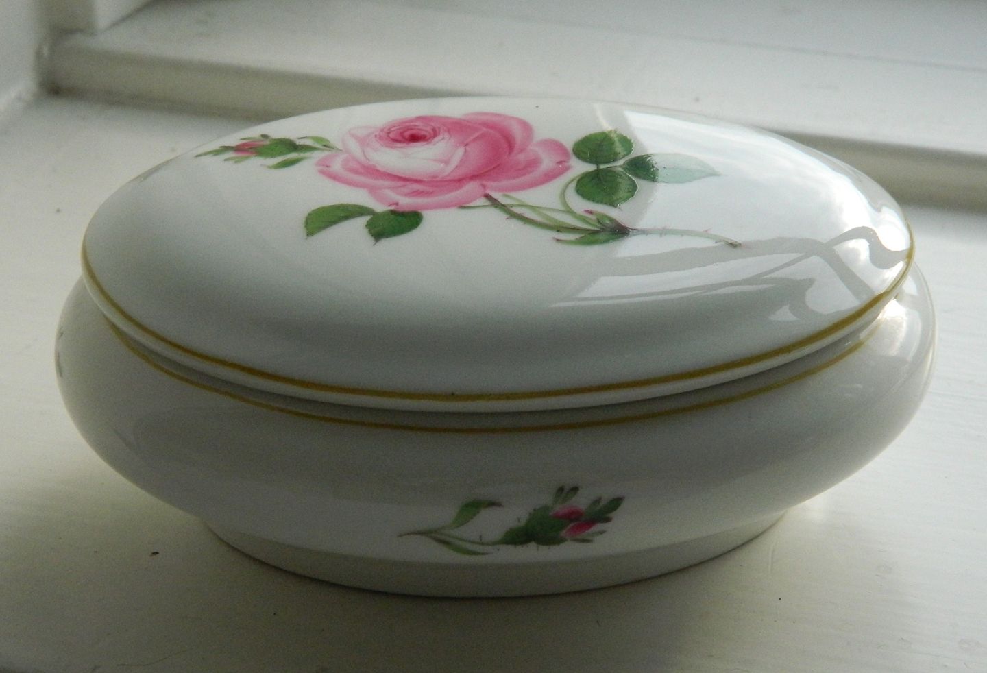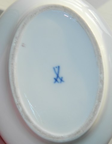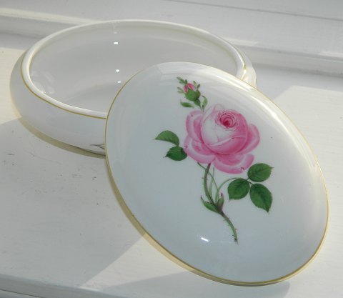 Skål med låg i porcelæn fra Meissen, Tyskland. Dekoreret med rose. Fremstår i perfekt stand. 1. sortering. Fabriksmærket på bunden. Mål: Højde: 5 cm, Længde: 12½ cm Dybde: 10 cm