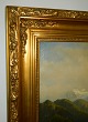 Stort maleri på lærred. Motiv med landskab samt bjerge. Fremstår i god stand. Kraftig guldramme i træ. Ingen signatur. Ingen skader eller reparationer. Mål: 94½ cm x 123 cm