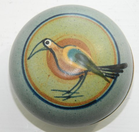 Lille lågskål på fod i keramik fra Dybdahl keramik med dekoration af fugl på låget. Fremstår i perfekt stand. Fabriksmærket på bunden. Mål: 6 cm høj og 8 cm i diameter.