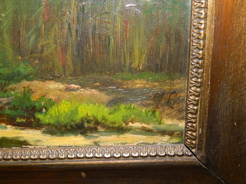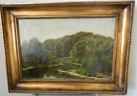 Maleri af Godfred Christensen 1845-1928: Olie på lærred 1869. Skovparti med sø. Mål 35 cm x 52 cm. Mål med ramme 48½ cm x 69 cm. I god stand uden skader eller reparationer. Signeret i nederste højre hjørne med G.C. Trænger til at blive renset !