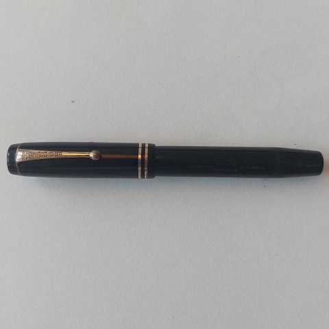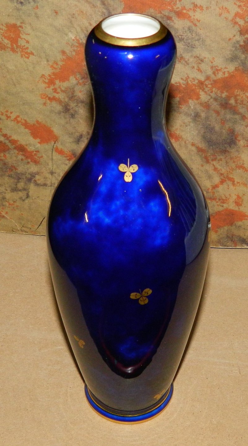 Organisk formet vase i porcelæn fra Sevres. Dækket af blå glasur med trekløver dekoration i guld. I perfekt stand. Form og dekoration i Art Nouveau stil. På bunden fabriksstemplet samt 1903. Vase er 24½ cm høj.
