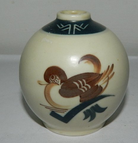 Sjælden karaffel med tilhørende propi keramik fra Lauritz Hjorth, Rønne, Bornholm fra begyndelsen af 20. århundrede. Bemalet dekoration i skønvirkestil. Fremstår i perfekt stand. Ingen skader eller reparationer. Fabriksmærket på bunden. Mål: 33 cm.