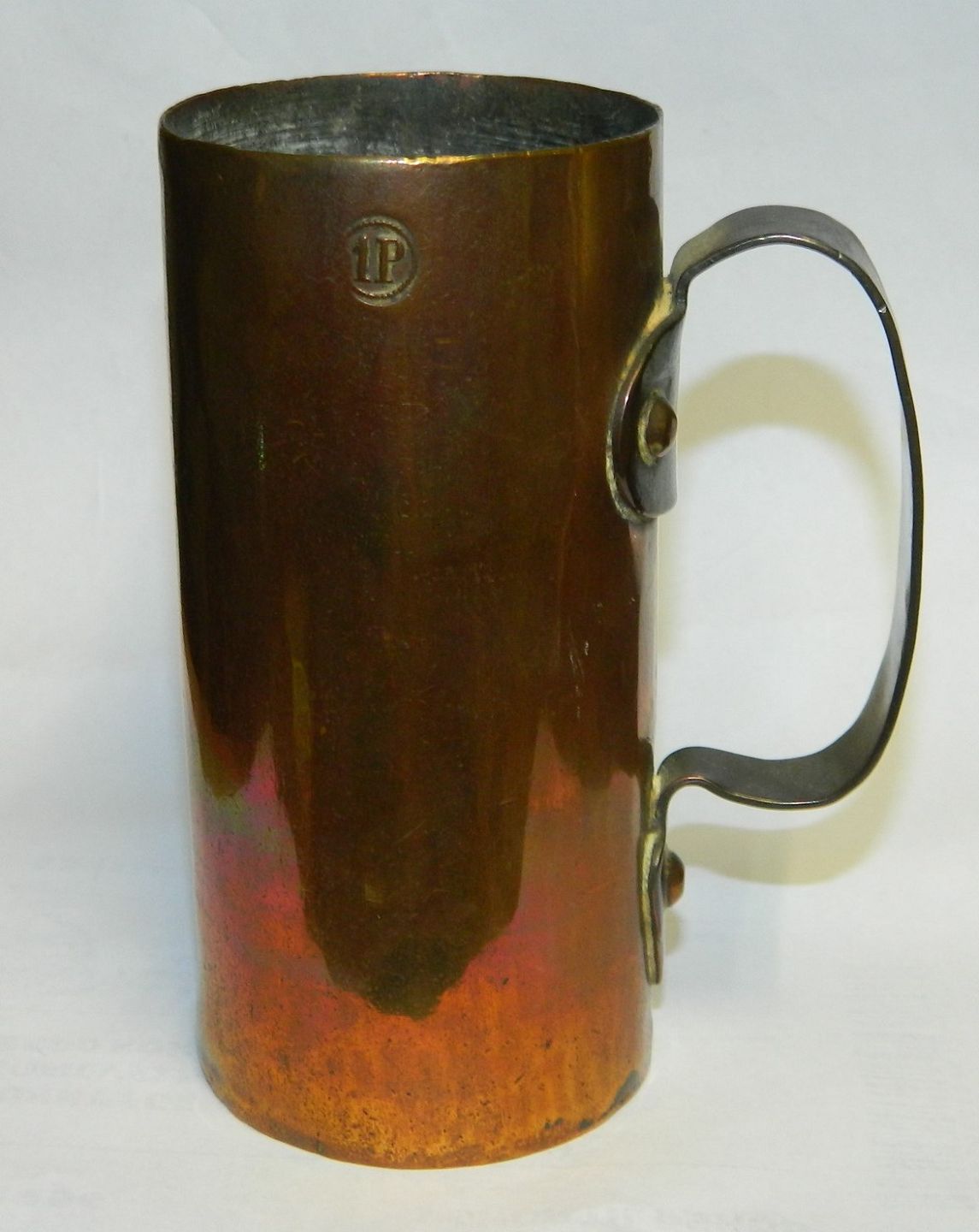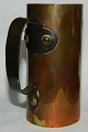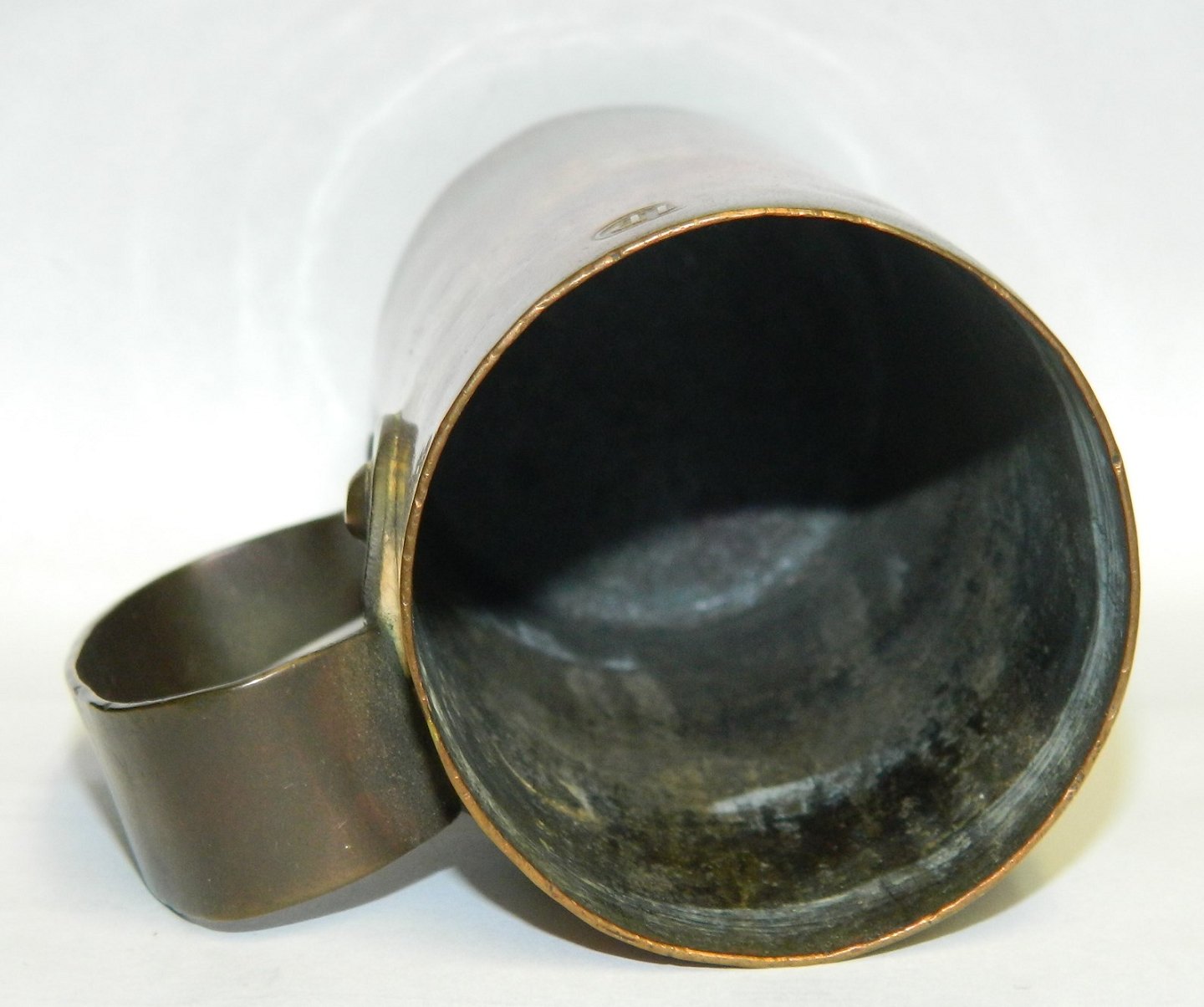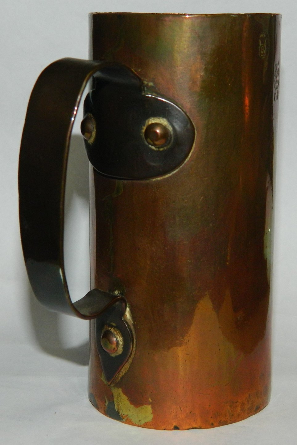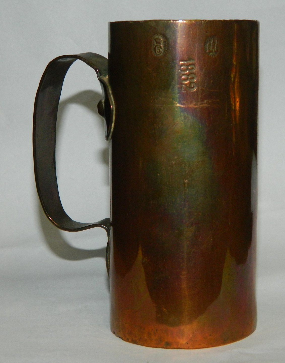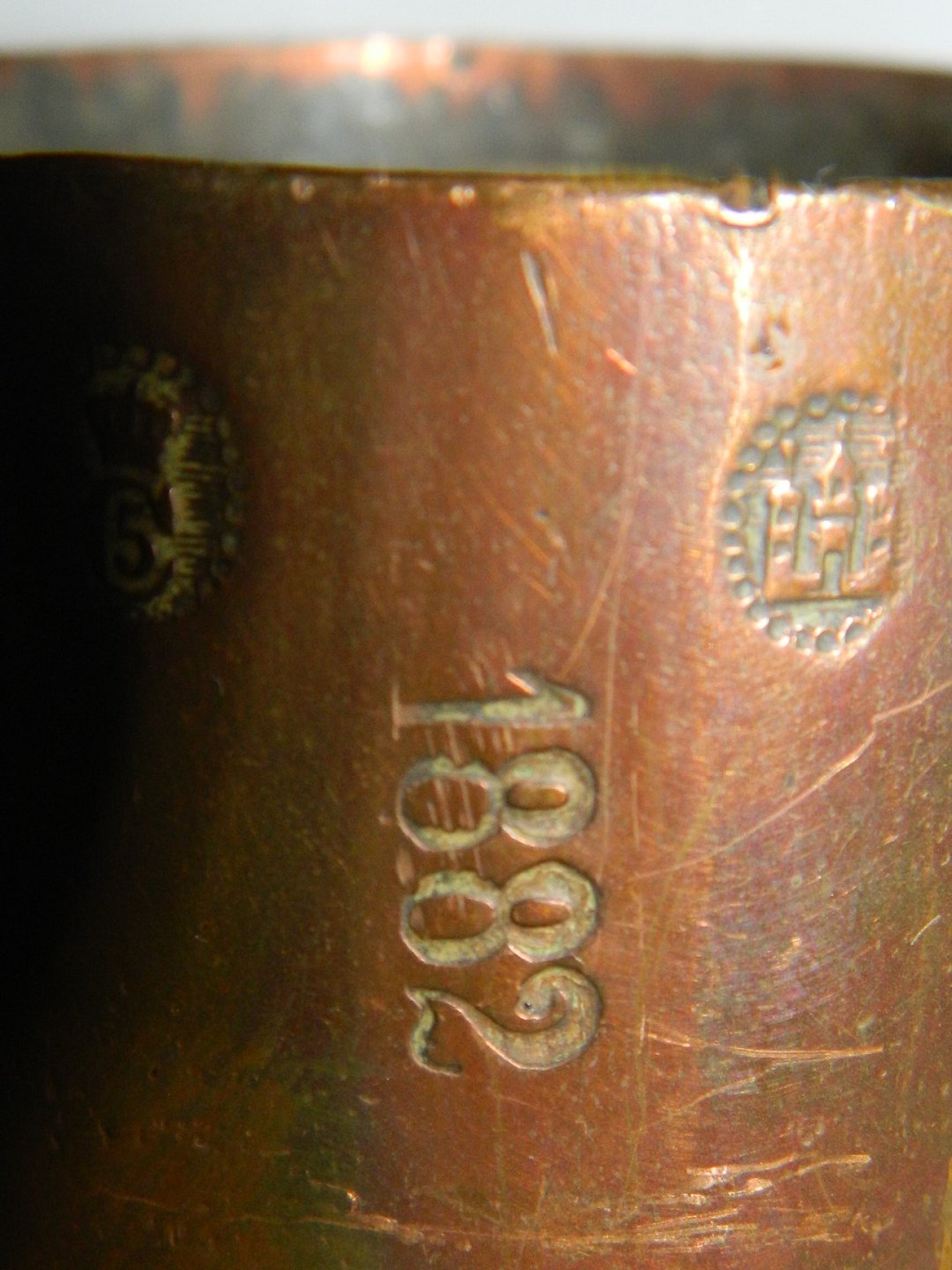 Cylinderisk målebæger i kobber med hank. Fremstår i god stand. Fine stempler som det fremgår af fotos. H. 11½ cm.