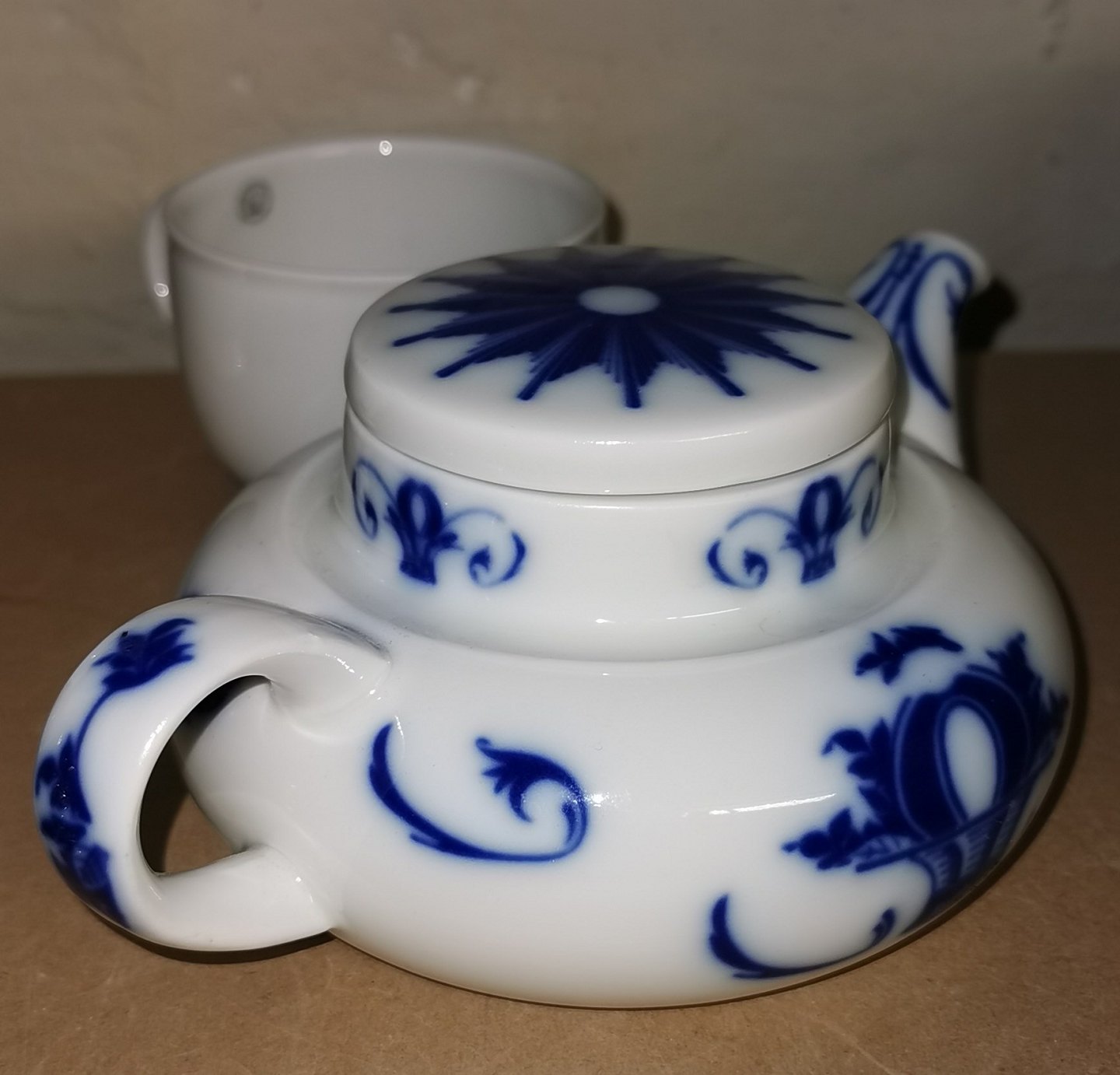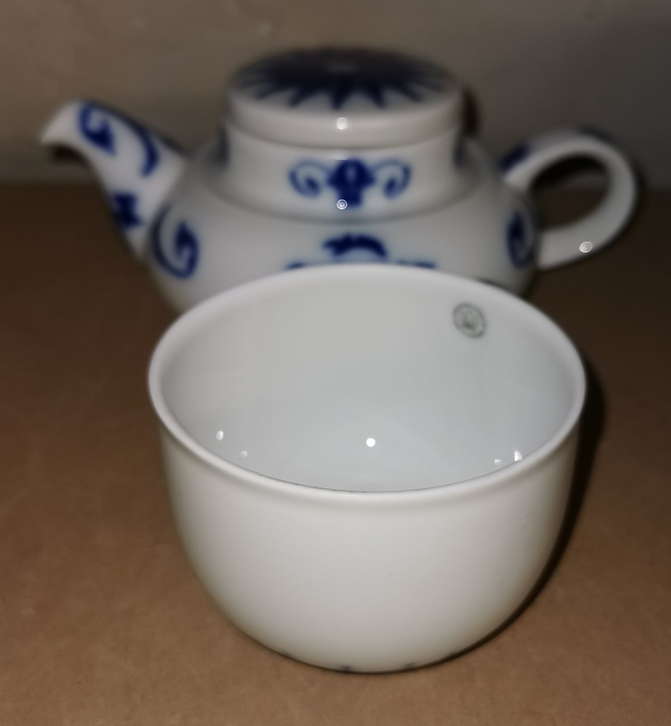 Bing & Grøndahl tekande med låg samt tilhørende kop. Dekoreret i blå farver. I perfekt stand. 1. sortering. Mål: H. 12 cm incl. kop samt 20 cm lang.