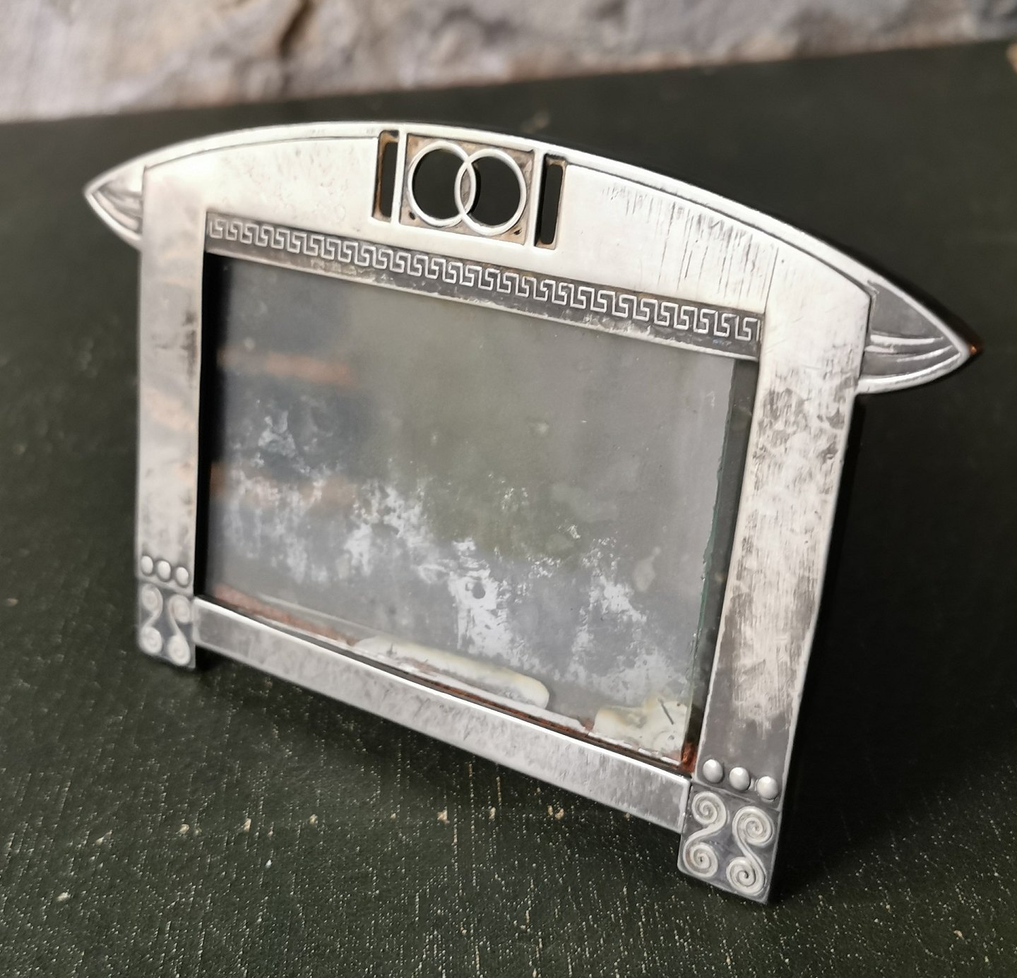 Art Deco ramme i metal fra WMF (Wurttembergische Metalwahrenfabric) Tyskland. Fremstår i god stand uden skader eller reparationer. Fremstillet omkring 1920. Fabriksmærket på bunden af rammen. Mål: H. 9½ cm B. 14½ cm.