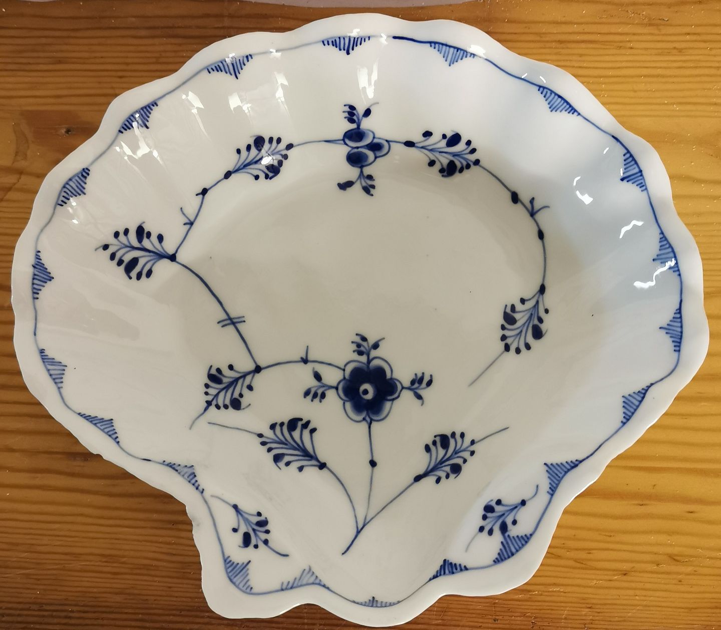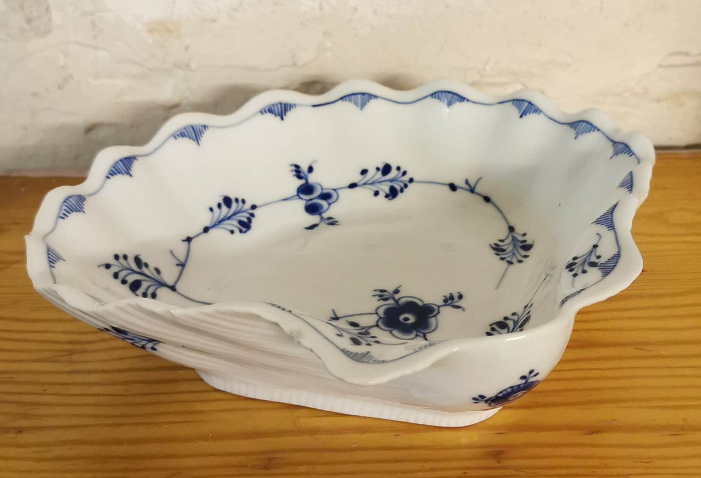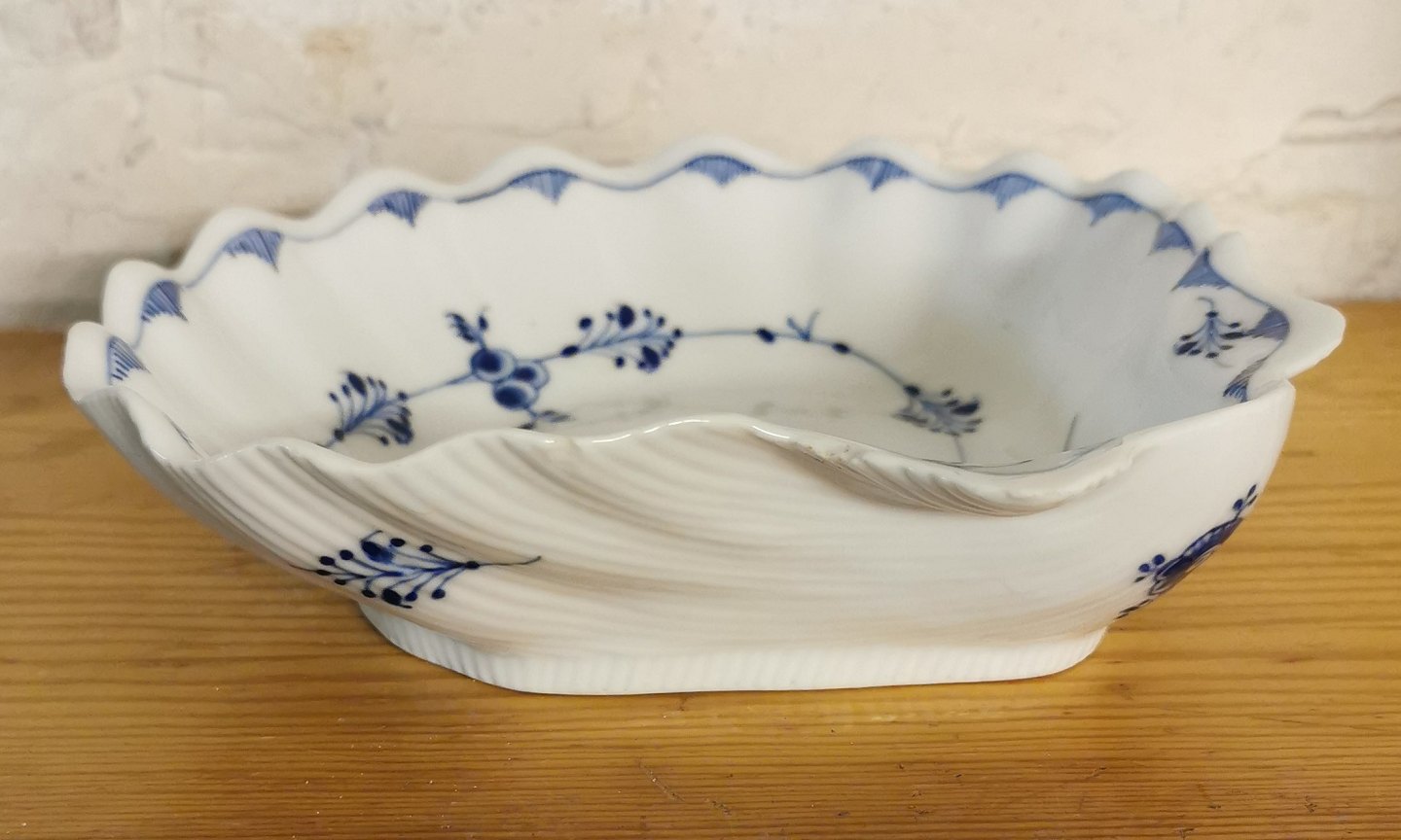 Muslingeskål i porcelæn med musselmalet dekoration fra Royal Copenhagen. Fremstillet mellem 1900-1923. Modelnummer 1/151. Fremstår desværre med to skår (se foto). Mål: Høj: 5 cm Bred: 22 cm Dyb: 18½ cm