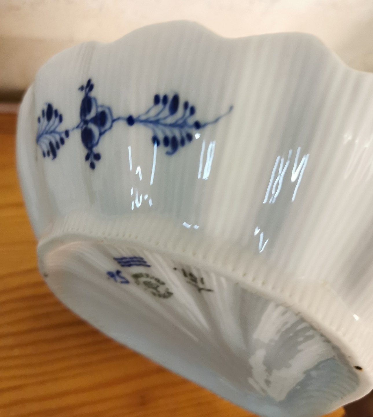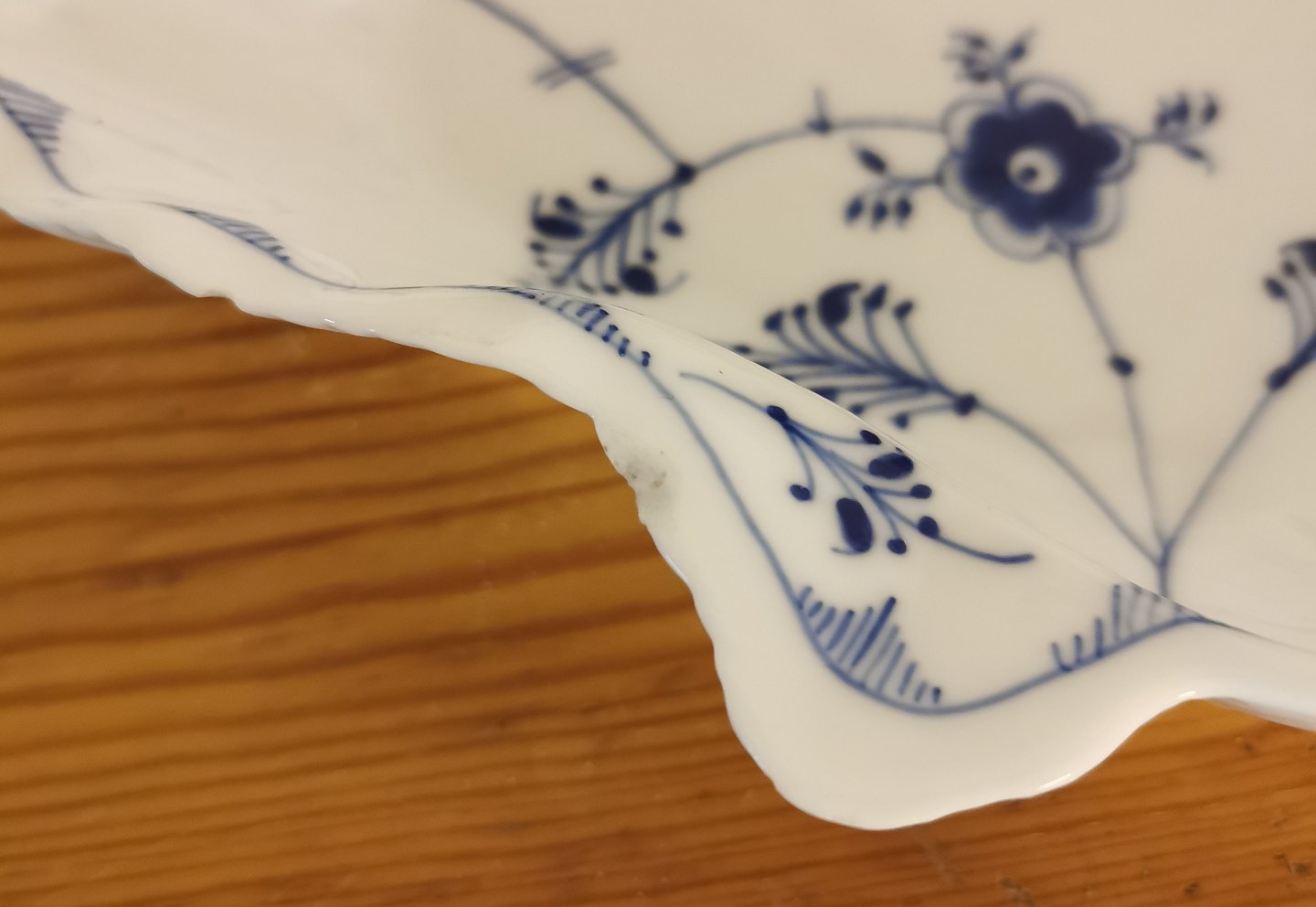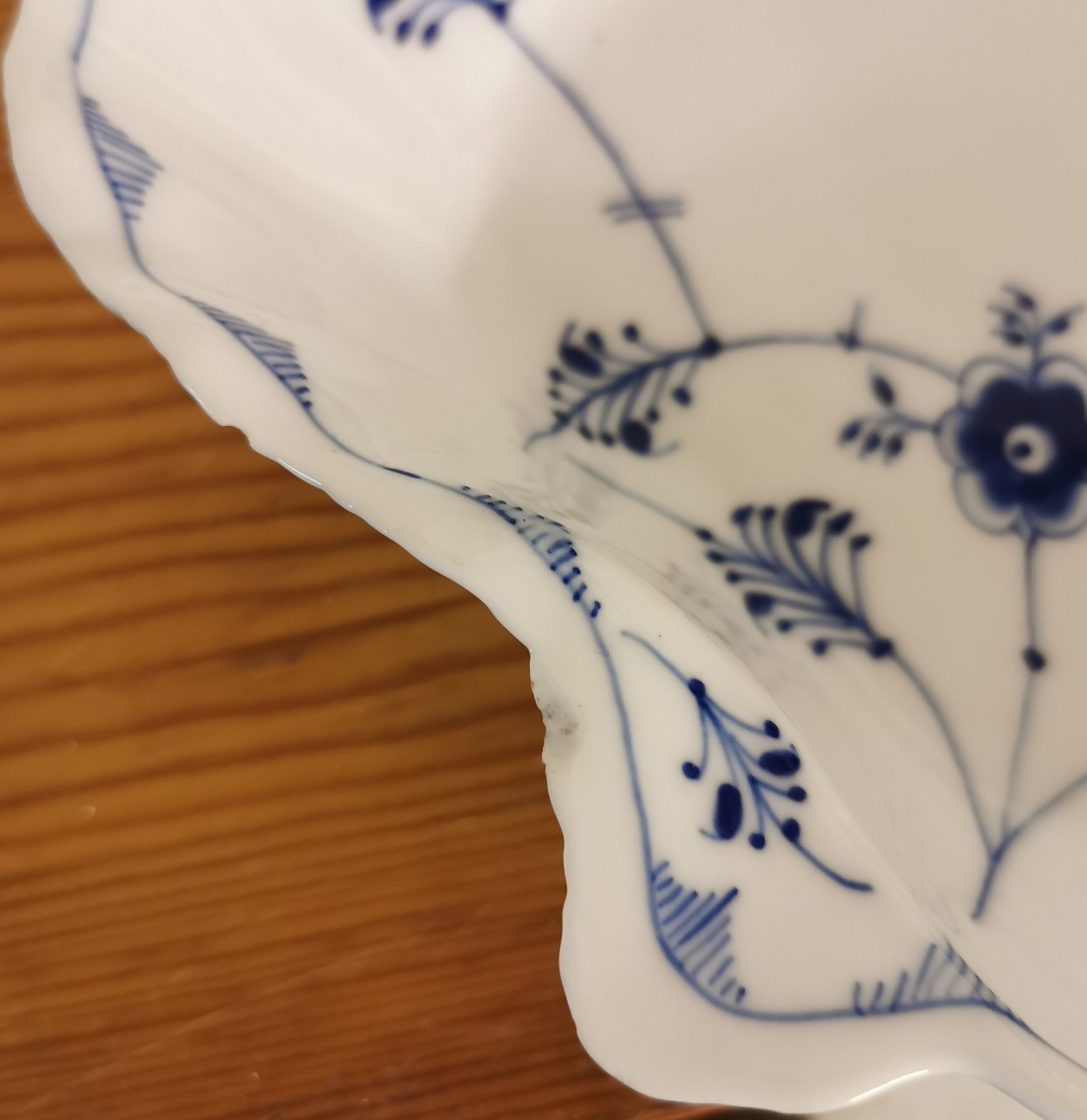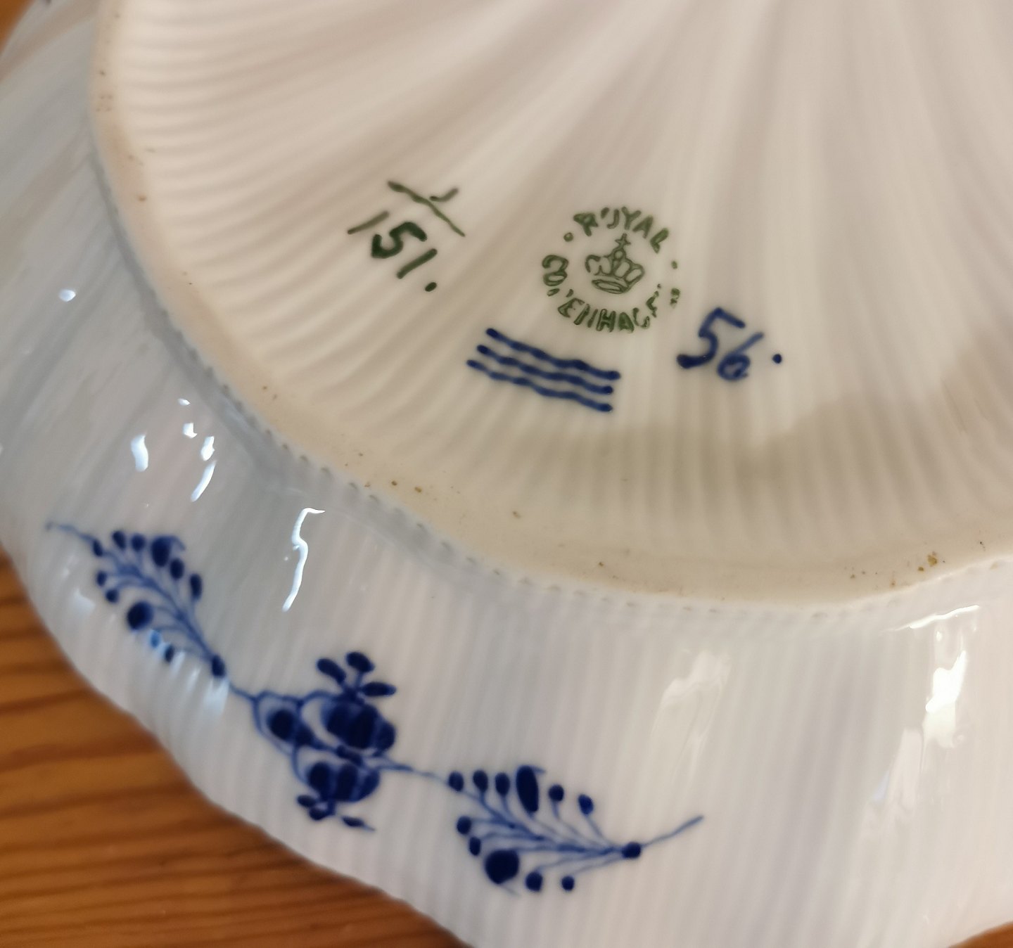 Muslingeskål i porcelæn med musselmalet dekoration fra Royal Copenhagen. Fremstillet mellem 1900-1923. Modelnummer 1/151. Fremstår desværre med to skår (se foto). Mål: Høj: 5 cm Bred: 22 cm Dyb: 18½ cm
