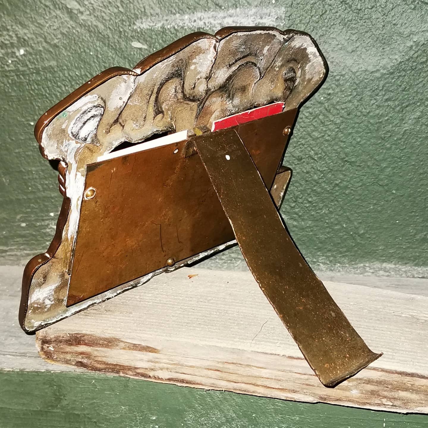 Ramme i metal til to fotografier. Dekoreret i skønvirkestil. To tilhørende glas medfølger. Fremstår i god stand. Armen, som rammen hviler på, kan ikke slås sammen. Fotografierne følger ikke med !